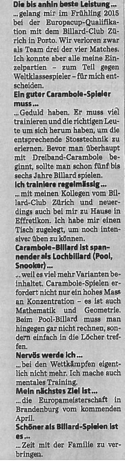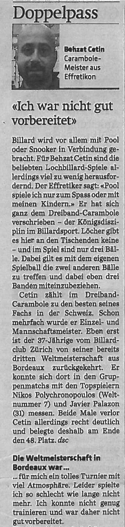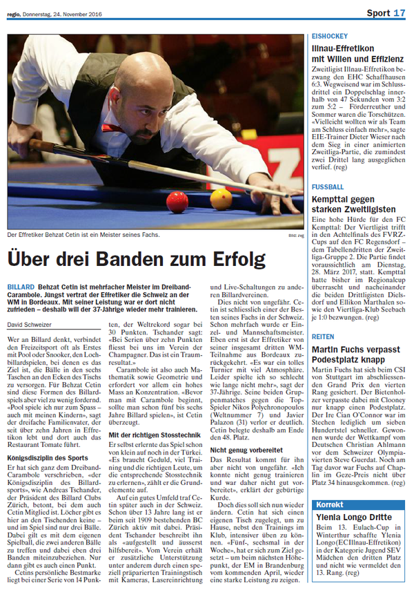 Bereits erschienen ist das Wochenmagazin "regio.ch", was an über 60000 Haushalte kostenlos verteilt wird. Hier wird sogar noch ausführlicher über Bezo, den Dreibandsport und den Billard Club Zürich berichtet.