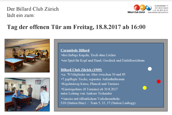 19:30-20:30 Dreiband High Run, Einsatz 5 CHF: Aus einer vorgegebenen Position kann man in 3 Versuchen probieren, daraus die höchste Tagesserie erzielen. Der Gewinner erhält ein Training mit Marco