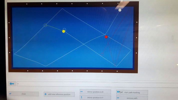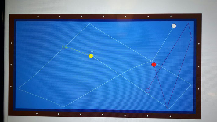 Dieser Ball hatte es in sich. Gian-Paolo mit Weiss spielt auf Rot, der tuscht und schlägt über 2 Banden den Spielball zurück zur Carambolage. Schwer zu sehen, ob der Spielball am Anfang die Vorbande hatte oder nicht. Er wurde vom Schiedsrichter gut gegeben - zurecht, wie hier auf dem Bild der Ballverfolgung zu sehen ist. Wichtig war dieser Ball, Gian-Paolo gelang nämlich daraus eine höhere Serie.von 7 und letztlich der Sieg in der Partie. Im Fussball und im Eishockey kommen vermehrt Videobeweis-Systeme zum Einsatz - das wird sich wahrscheinlich auch im Billard nach und nach durchsetzen..